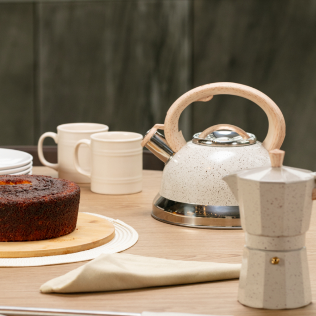 A chaleira é feita totalmente em aço inox, resistente e durável.